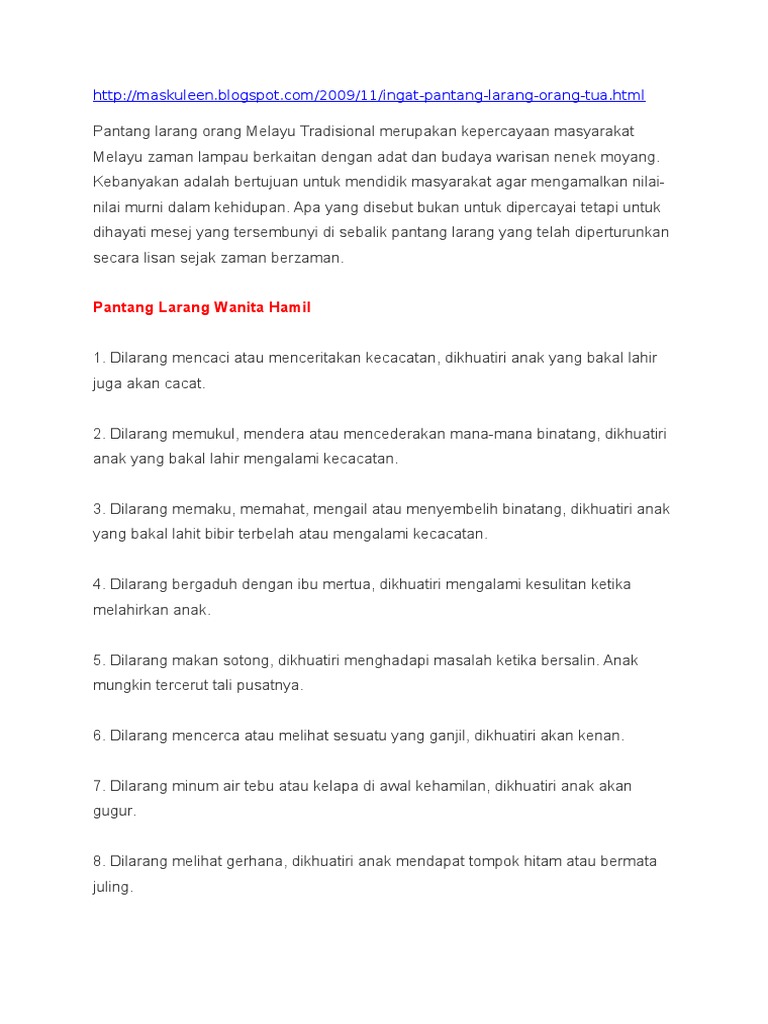 Pantang Larang Orang Melayu / Pantang larang orang melayu tradisional merupakan kepercayaan masyarakat melayu zaman lampau berkaitan dengan adat dan budaya warisan nenek moyang.. Anda pasti biasa mendengar orang tua berkata sekiranya ibu yang sedang hamil mengidam sesuatu namun tidak mendapatnya, bayinya nanti akan menjejes air liur. Pantang larang dengan masyarakat melayu berpisah tiada. Sebenarnya, pantang larang ni juga bertujuan untuk mendidik masyarakat khususnya generasi muda tentang kehidupan. Tak boleh duduk atas bantal, tak boleh menyanyi di dapur Adat resam merupakan adat yang diwarisi oleh sesuatu masyarakat secara turun temurun oleh nenek moyang mereka bagi mengekalkan tradisi kaum mereka.