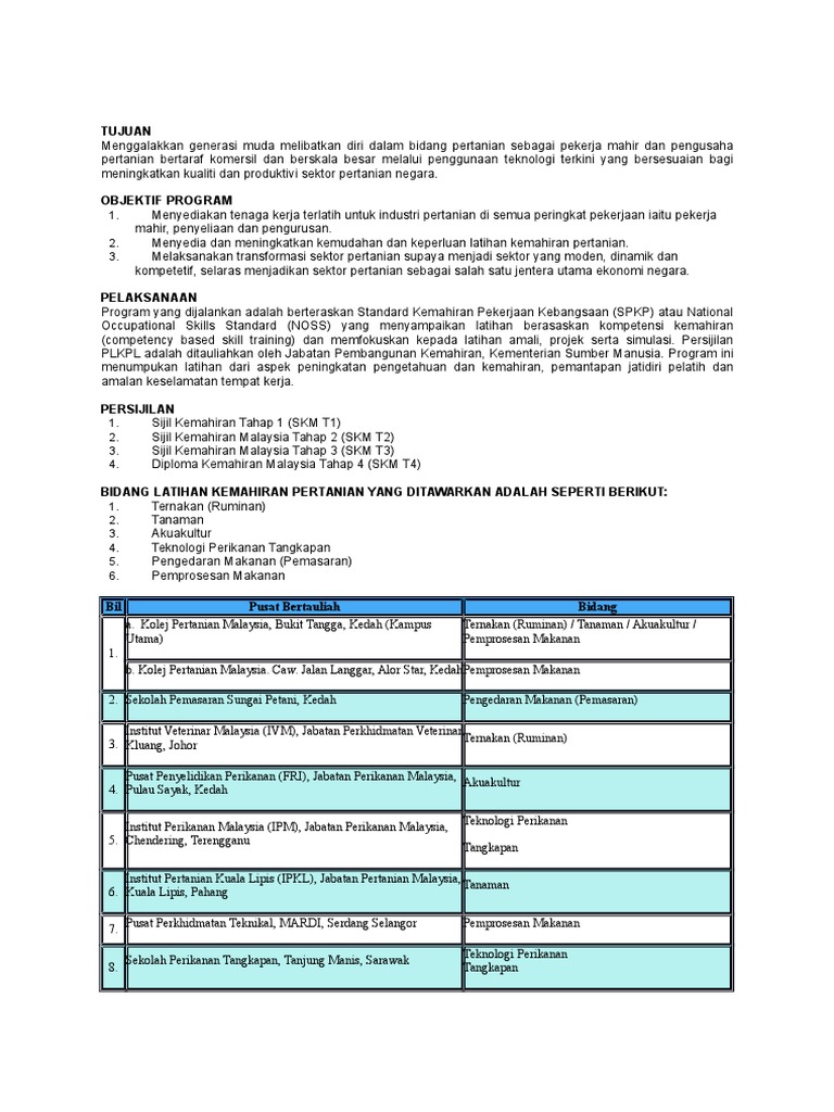 • bertujuan mengenalpasti keperluan pembangunan dan latihan di pusat bertauliah program latihan kemahiran pertanian kebangsaan dan institusi latihan pertanian. 28, persiaran perdana, presint 4, 62624 putrajaya. Institut latihan pertanian kolej pertanian malaysia, kedah manis, sarawak. Bidang latihan kemahiran pertanian yang ditawarkan. Majlis latihan pertanian kebangsaan (natc) telah ditubuhkan bagi merancang, menyedia, menyelaras dan menilai perlaksanaan plkpk.